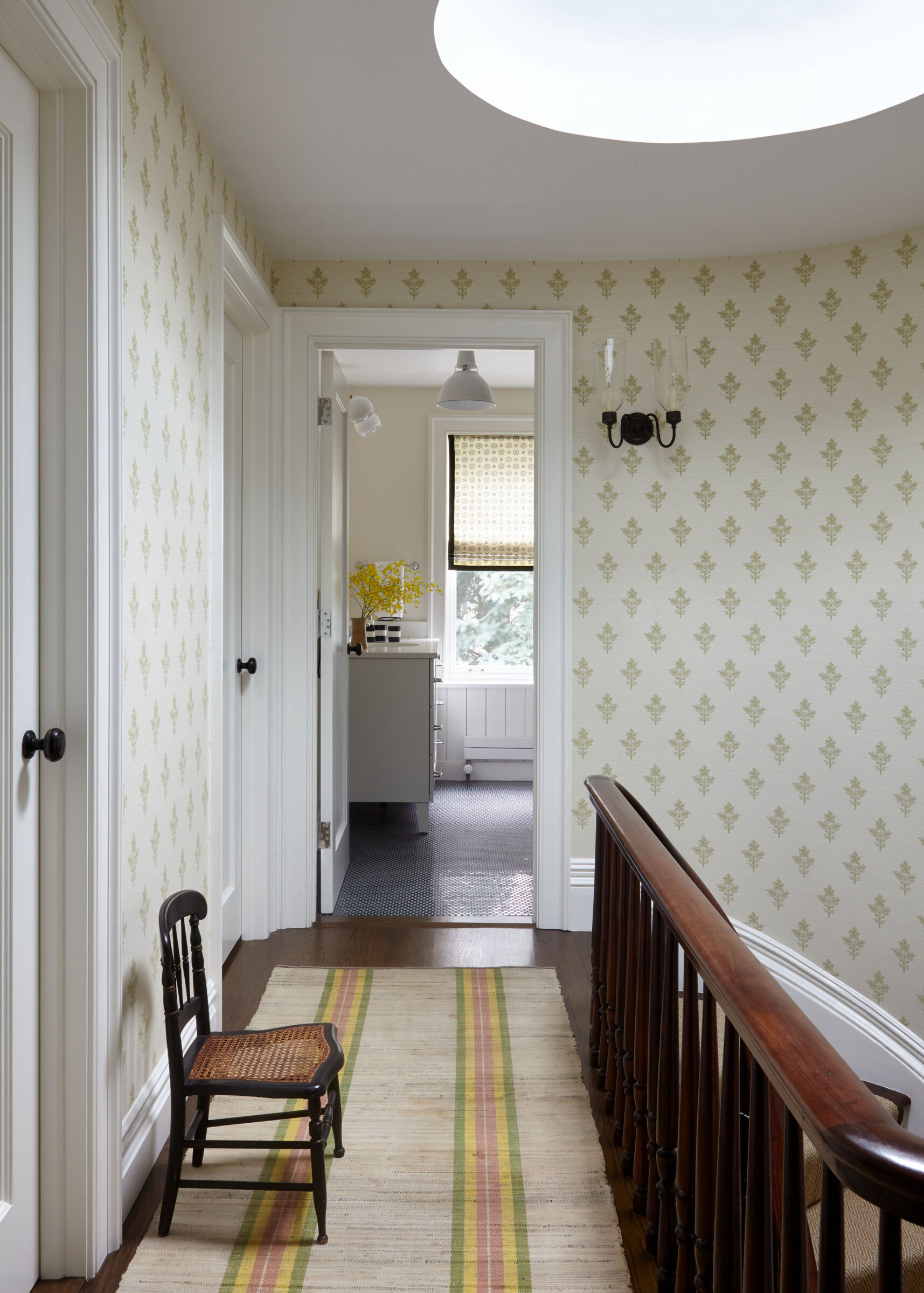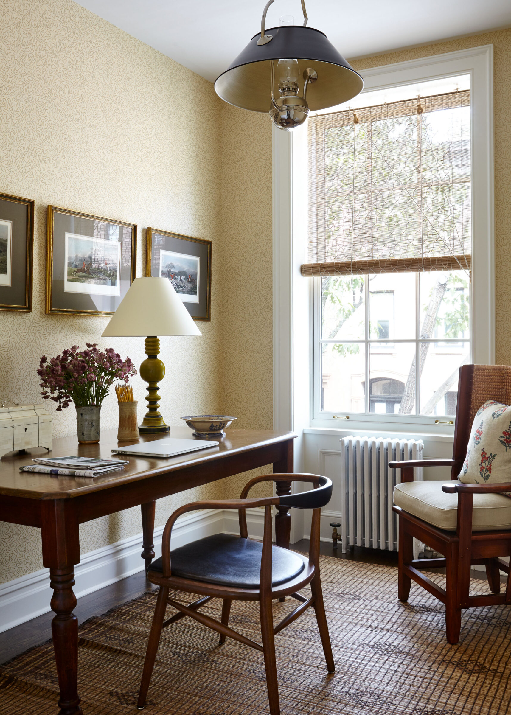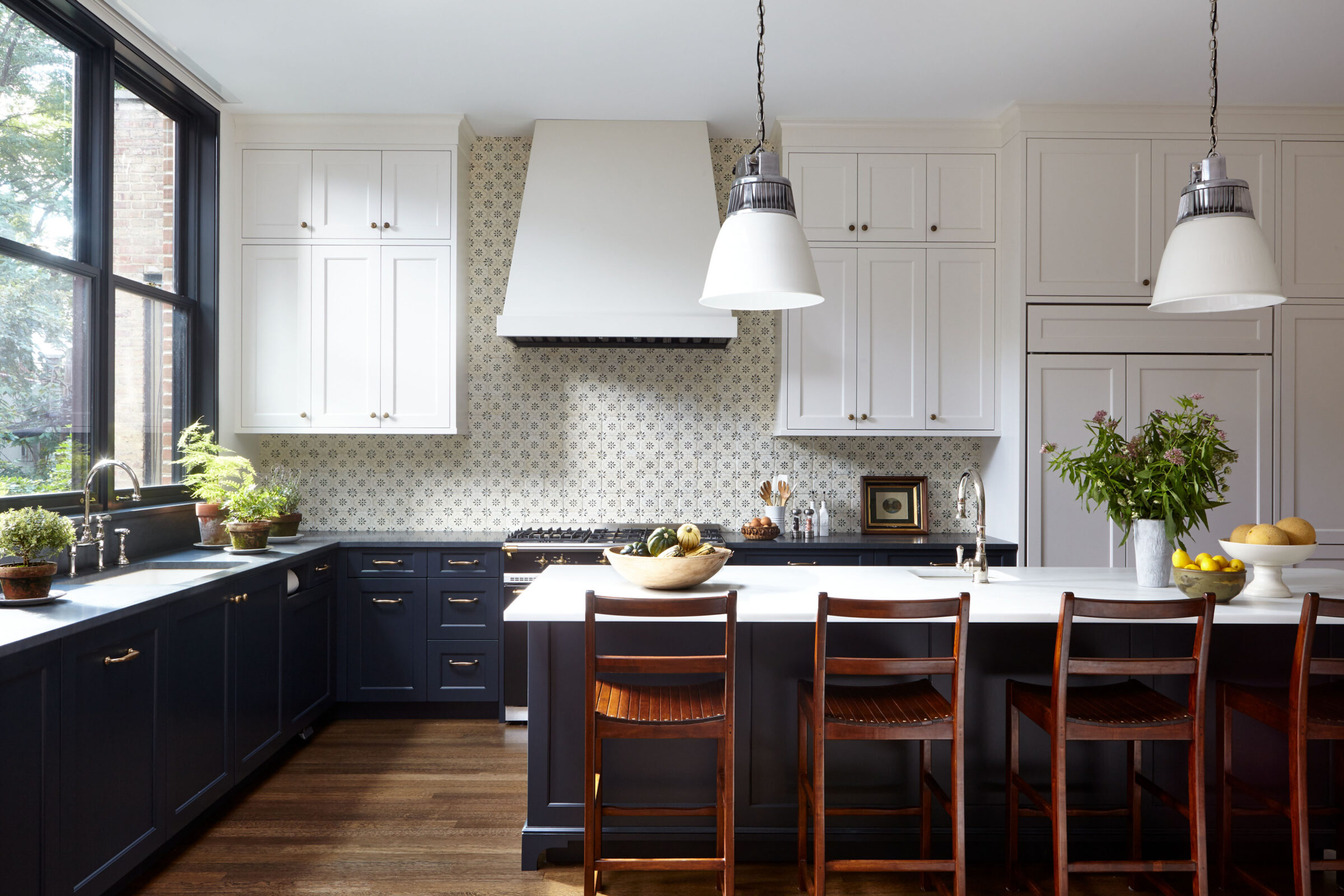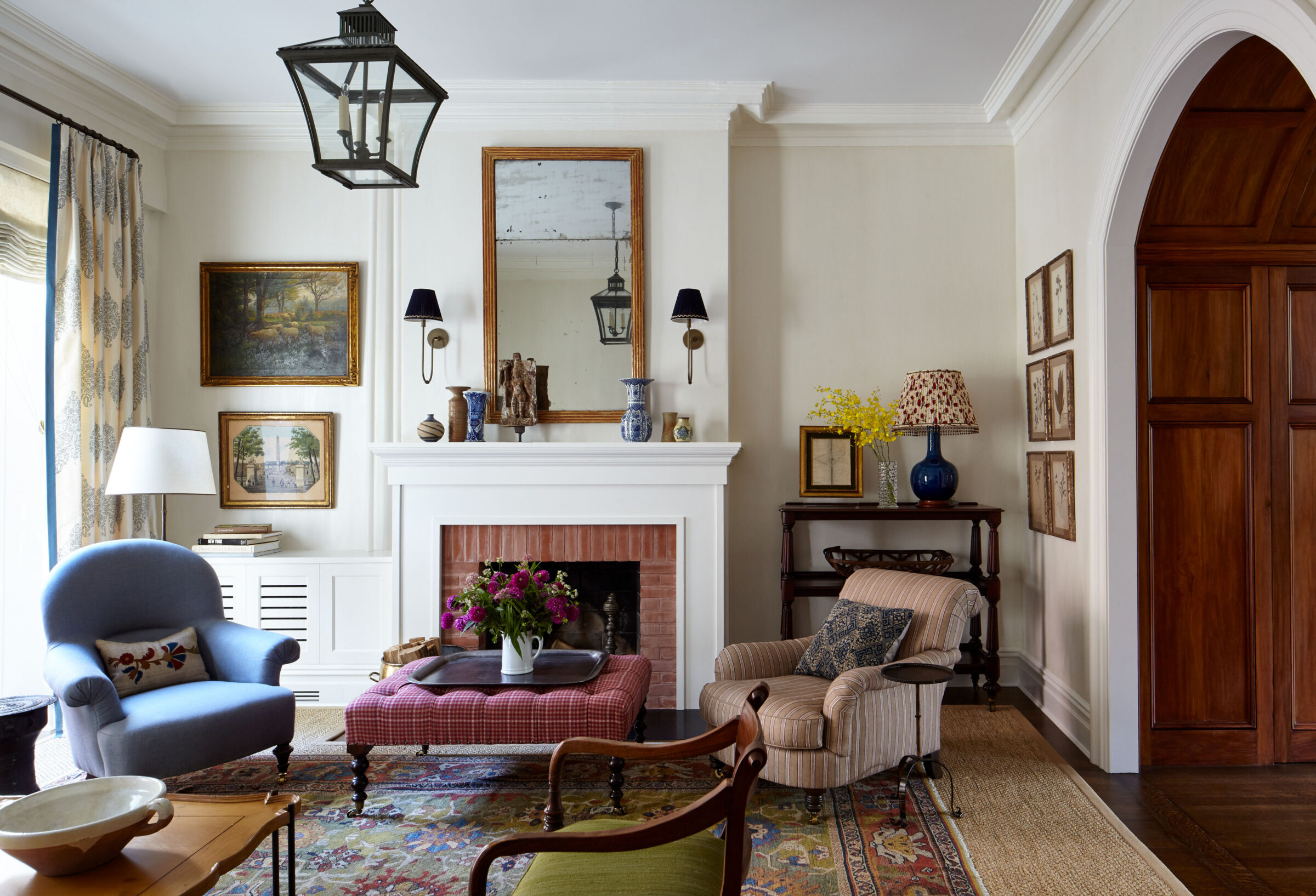 This Greek Revival brownstone underwent an extensive renovation to bring it up to today’s standards, including adding an extension to the back of the house to accommodate a larger kitchen and dining area. The client requested a design that felt traditional, but not dated. A healthy dose of pattern and rich colors were devised to evoke the English country style homes the couple had always admired. In the living room, an antique Sultanabad rug introduces the blue, red, and green color story that weaves its way throughout the house. The newly updated kitchen was designed with a black and white palette inspired by antique hand painted ceramic tiles from Morocco.