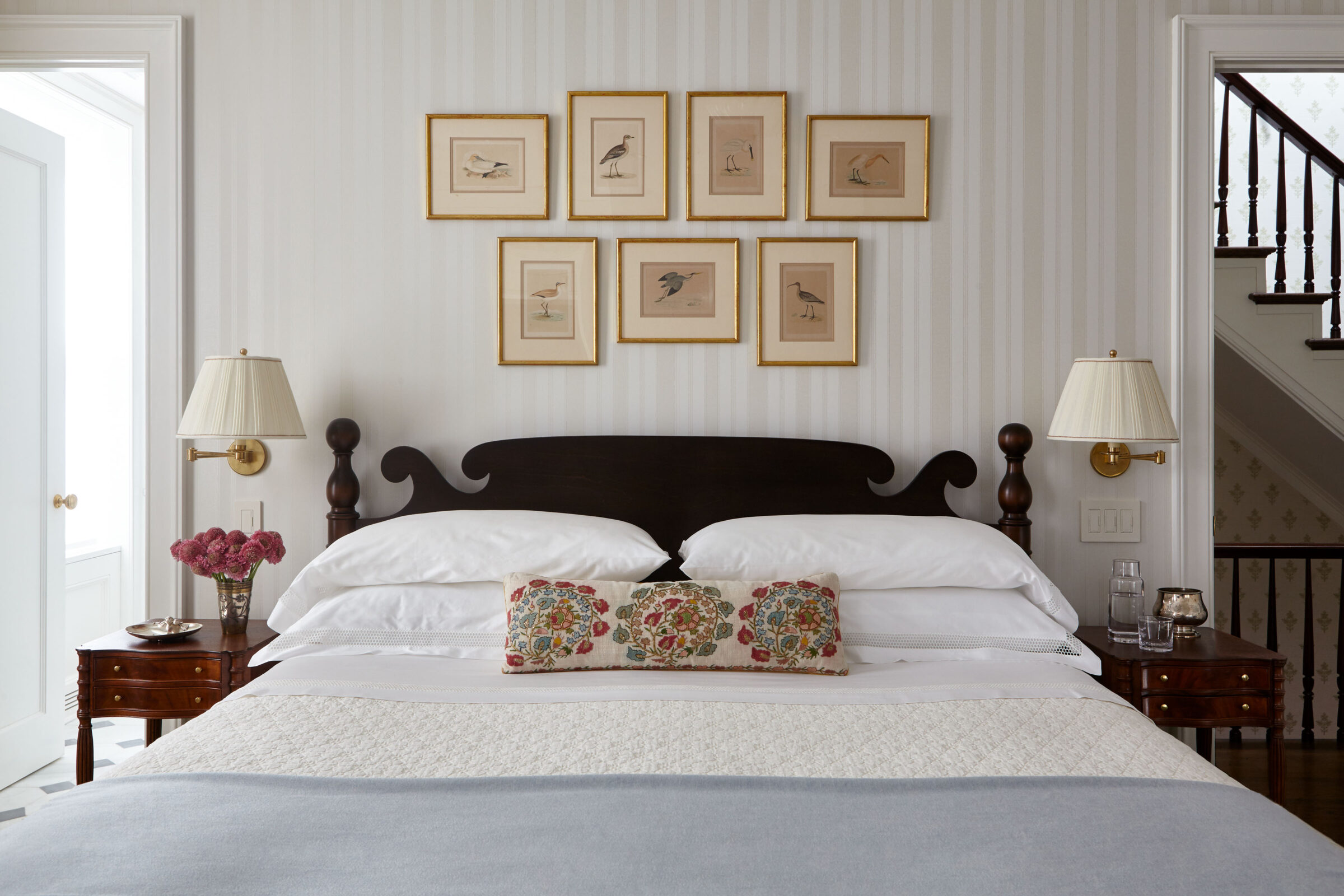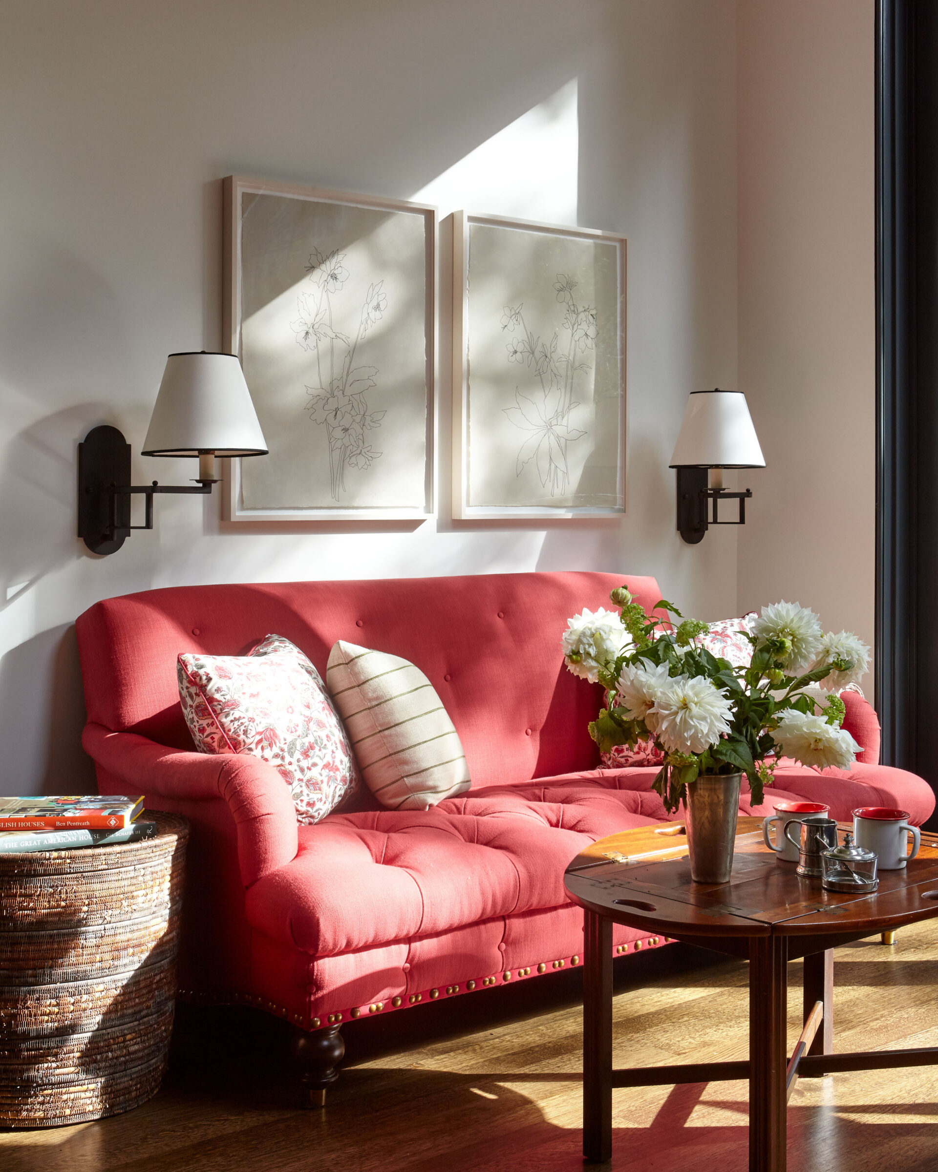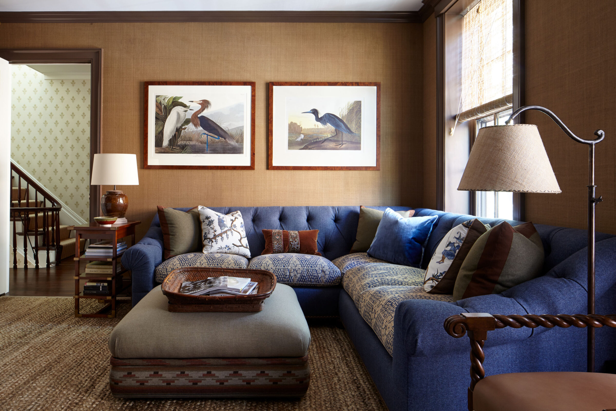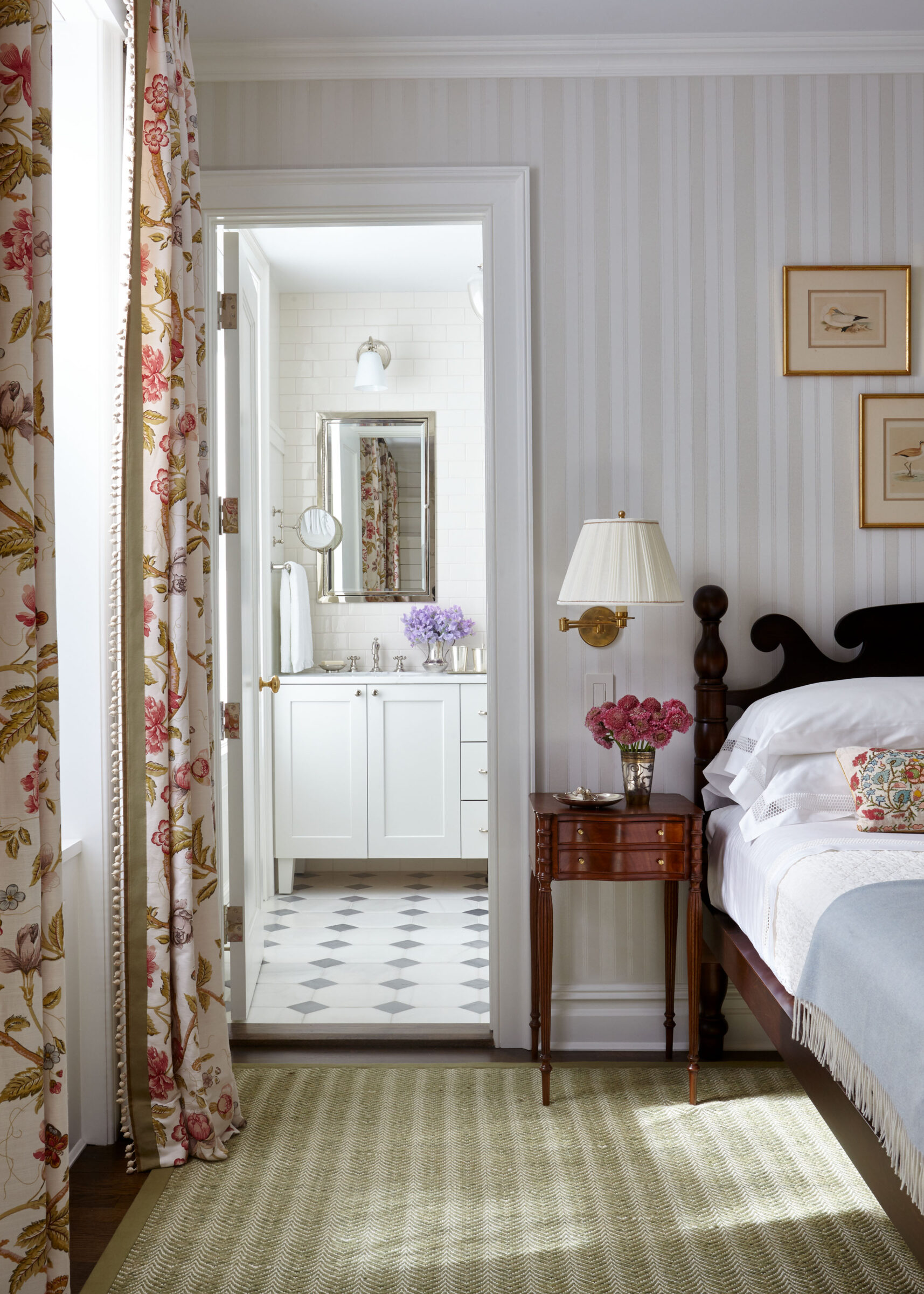 This Greek Revival brownstone underwent an extensive renovation to bring it up to today’s standards, including adding an extension to the back of the house to accommodate a larger kitchen and dining area. The client requested a design that felt traditional, but not dated. A healthy dose of pattern and rich colors were devised to evoke the English country style homes the couple had always admired. In the living room, an antique Sultanabad rug introduces the blue, red, and green color story that weaves its way throughout the house. The newly updated kitchen was designed with a black and white palette inspired by antique hand painted ceramic tiles from Morocco.