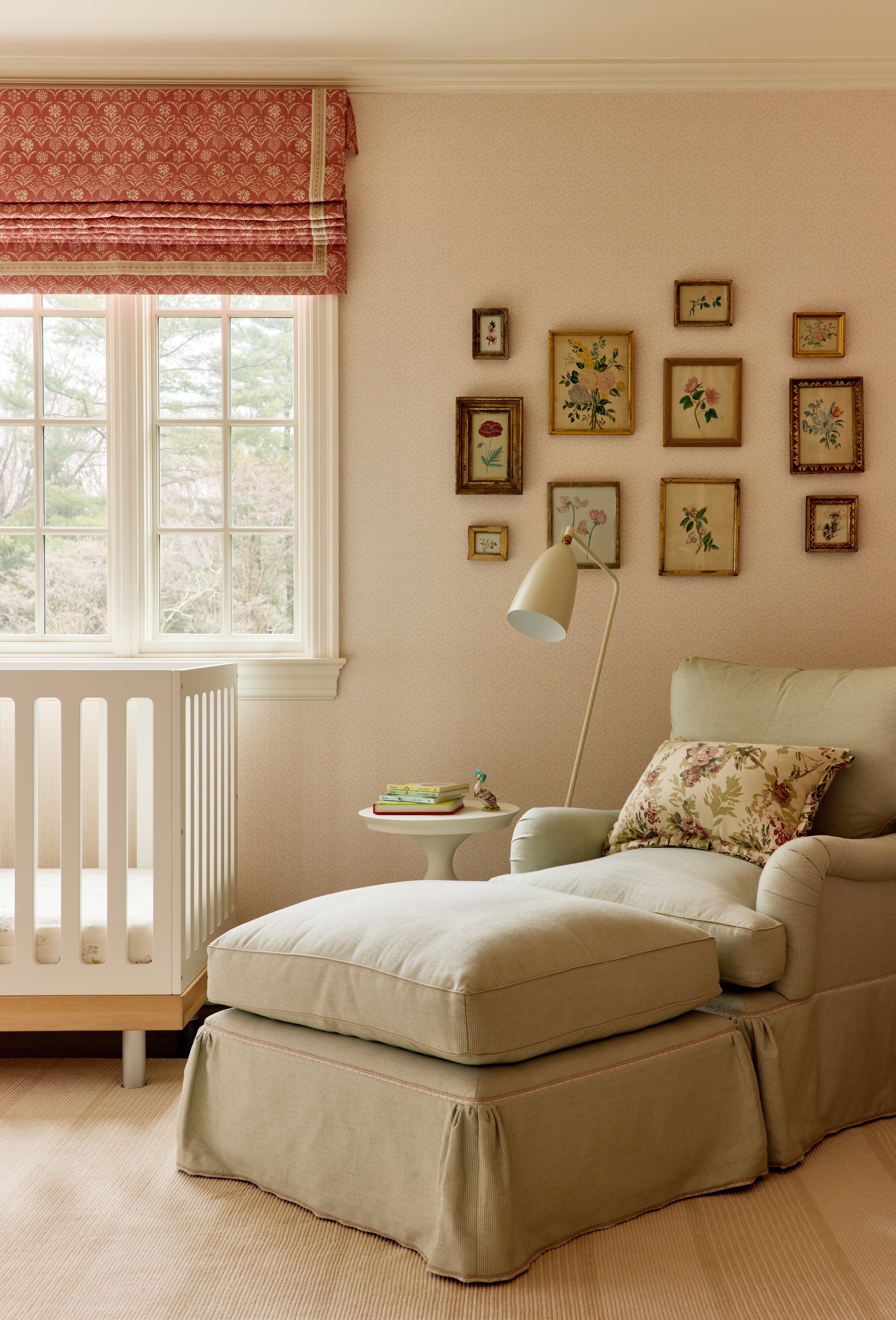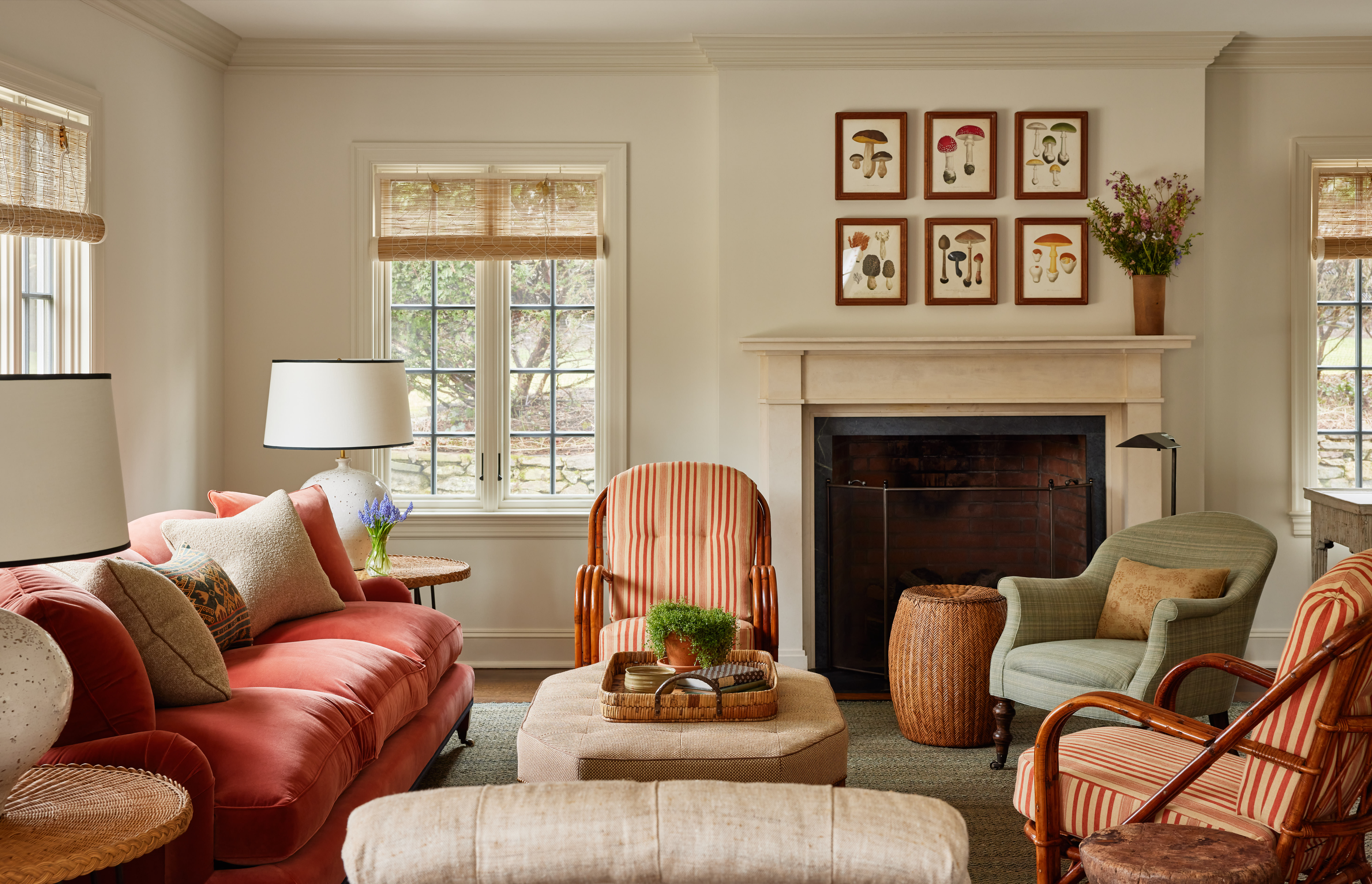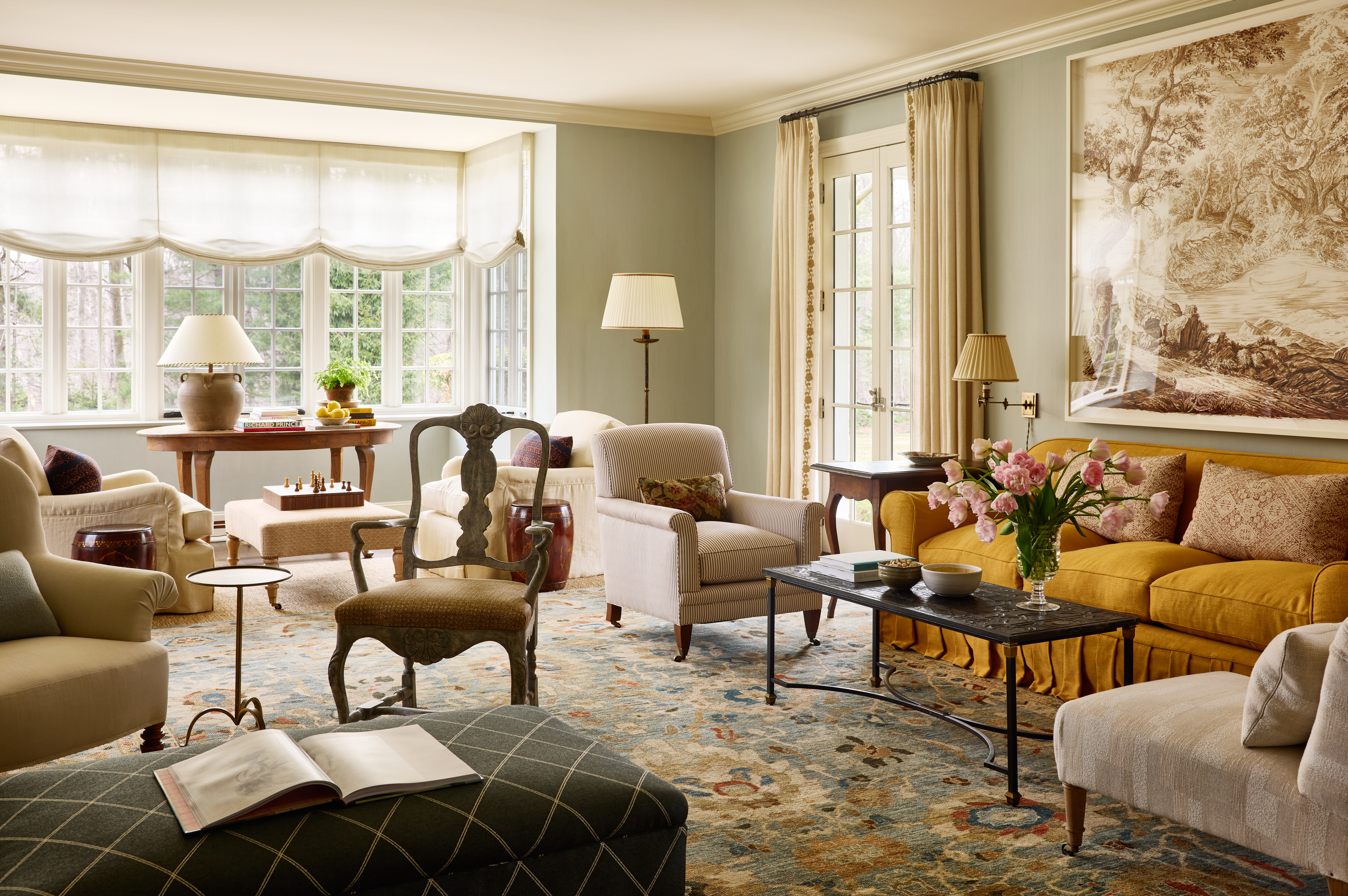 For a client that lives mainly in New York City, the goal was to create a year-round retreat for weekends and summers. A few directives from them: warm colors, English countryside, soft florals, comfortable – grounded the design strategy. A pleasing mixture of antique Persian rugs, richly hued upholstery, and antique furniture create a layered, collected feeling. An oversized drawing by Rick Shaefer hanging over the ochre colored sofa in the living room feels like a modern day tapestry in its detail and dramatic effect. In the stair hall, an Indian floral motif is stenciled on grasscloth covered walls creating a lovely passageway throughout the house.