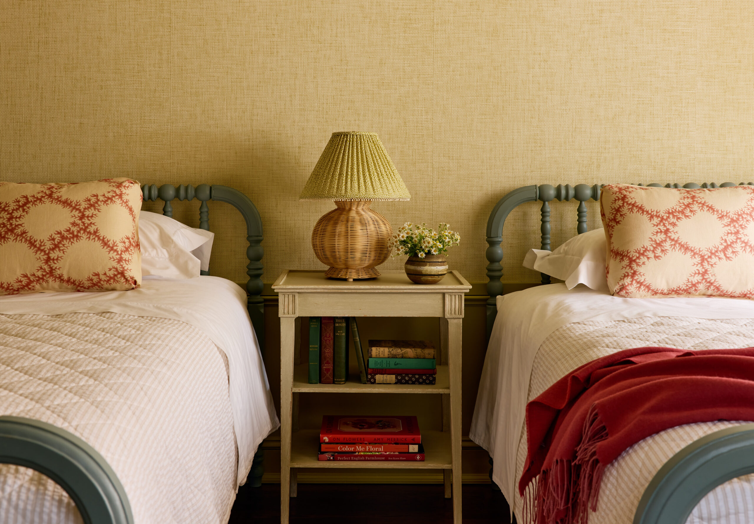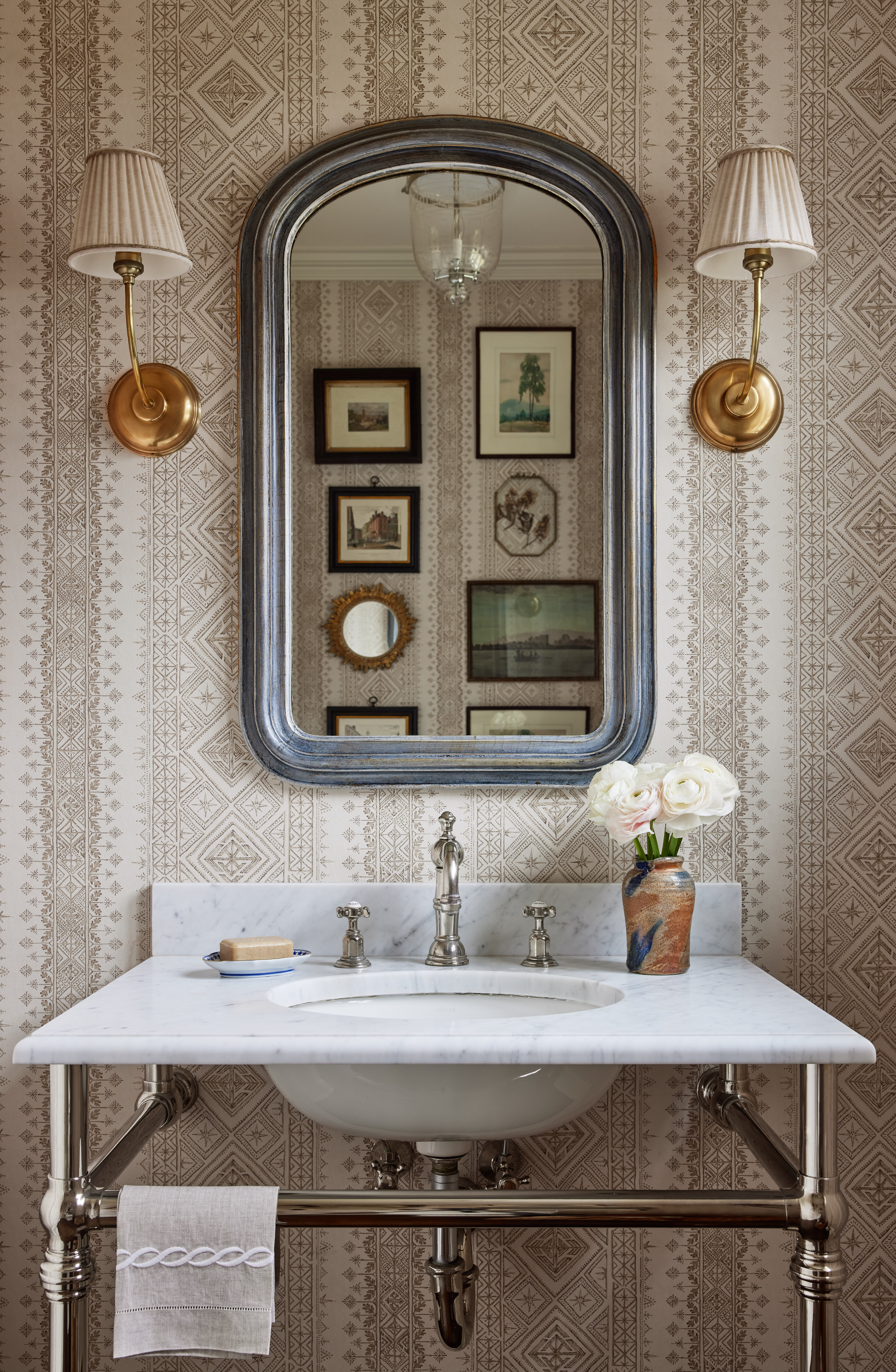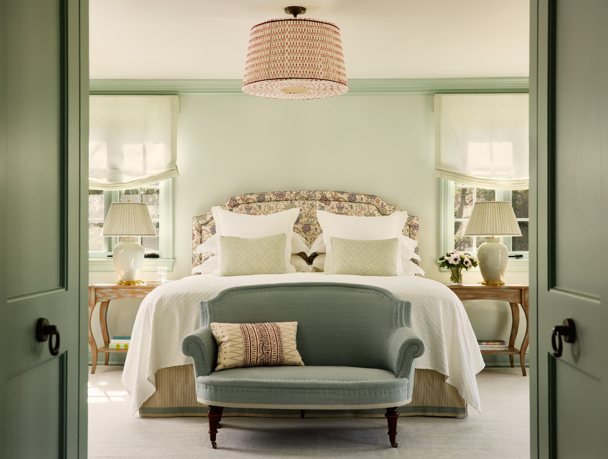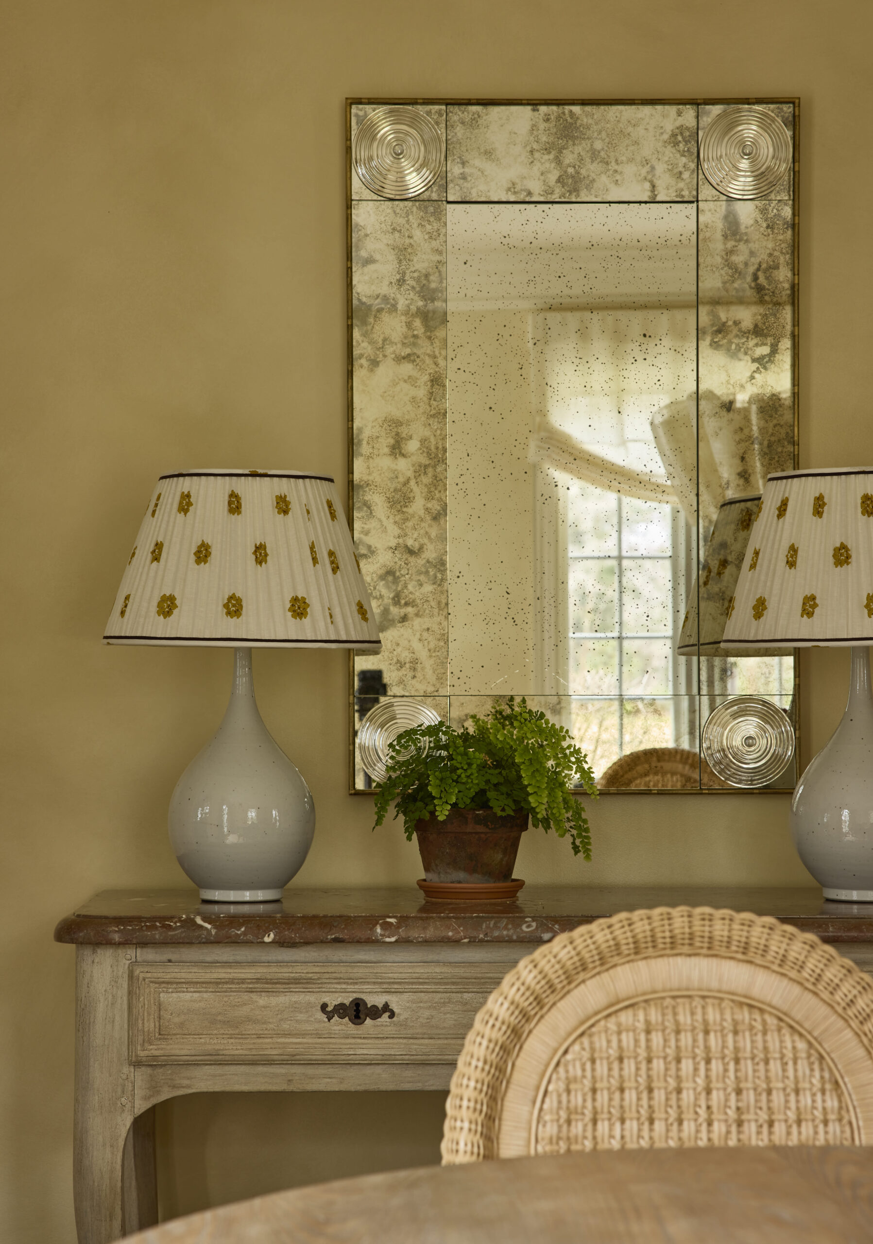 For a client that lives mainly in New York City, the goal was to create a year-round retreat for weekends and summers. A few directives from them: warm colors, English countryside, soft florals, comfortable – grounded the design strategy. A pleasing mixture of antique Persian rugs, richly hued upholstery, and antique furniture create a layered, collected feeling. An oversized drawing by Rick Shaefer hanging over the ochre colored sofa in the living room feels like a modern day tapestry in its detail and dramatic effect. In the stair hall, an Indian floral motif is stenciled on grasscloth covered walls creating a lovely passageway throughout the house.