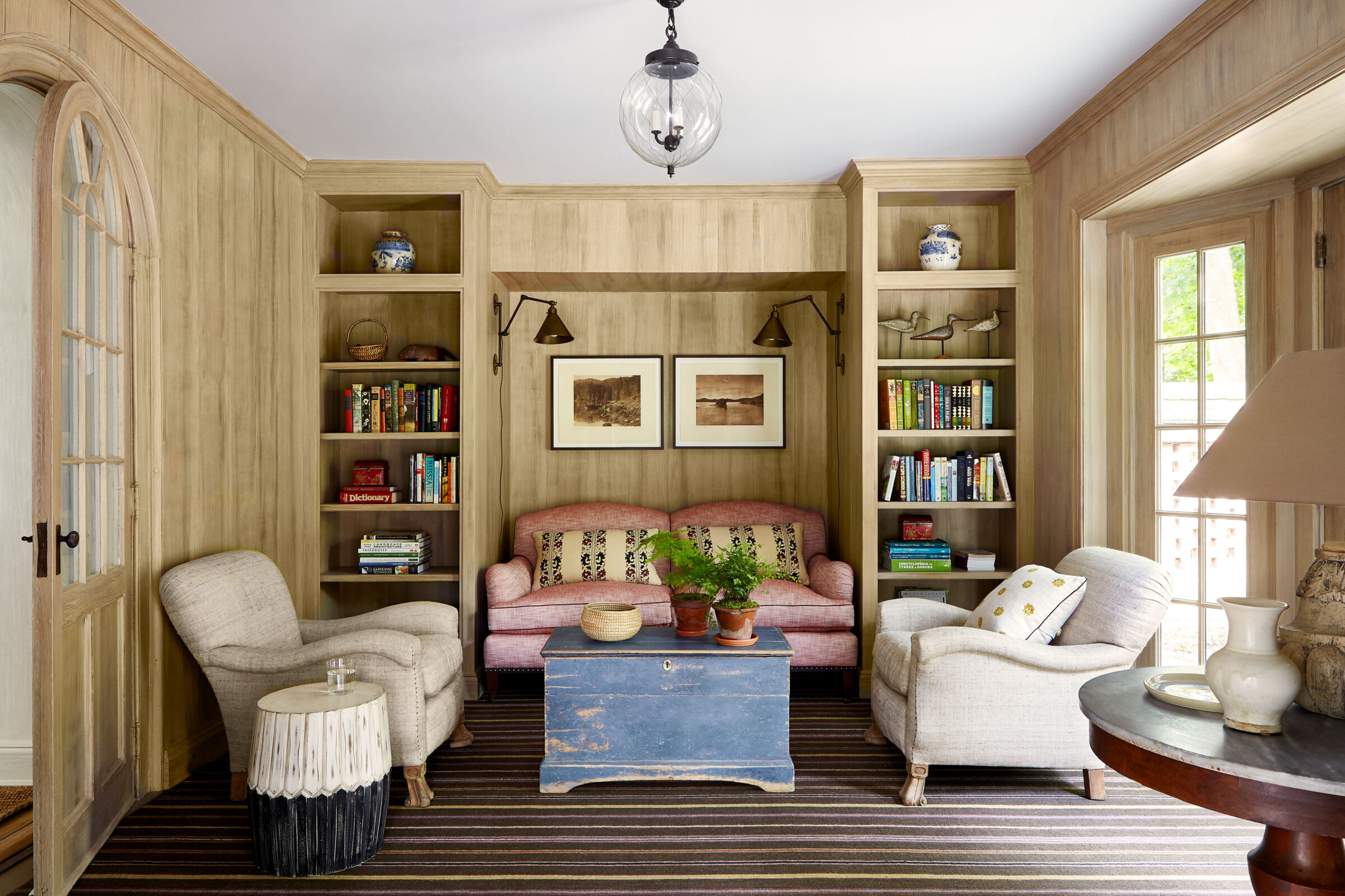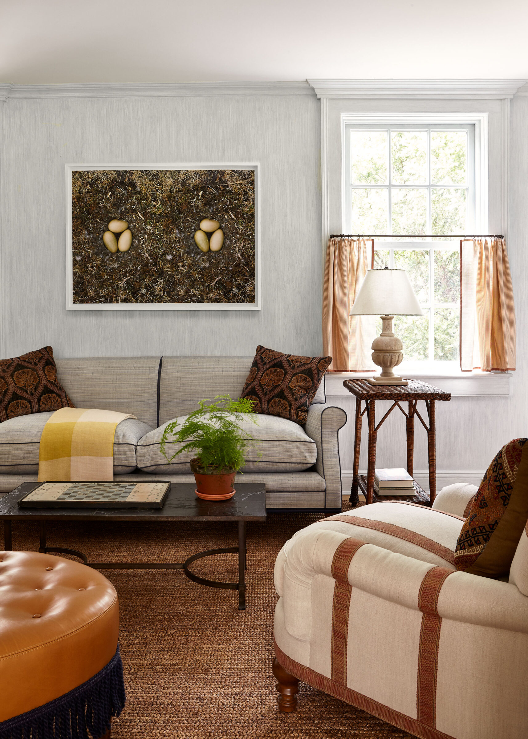 For the renovation of an early 1800’s farmhouse on Long Island, we were brought in to bring back the architectural integrity of our client’s home. While the house still had some important elements intact, much of the renovation was focused on adjusting the flow of the rooms and adding architectural elements where they had been removed. Custom upholstered furniture brought comfort and warmth while an eclectic mix of antiques from England, France, Sweden, and Spain infused each room with storied gravitas. Small details reveal themselves in the jute trim of the custom lampshades, the naive faux bois paint of the library walls, and the found textiles on the pillows throughout.