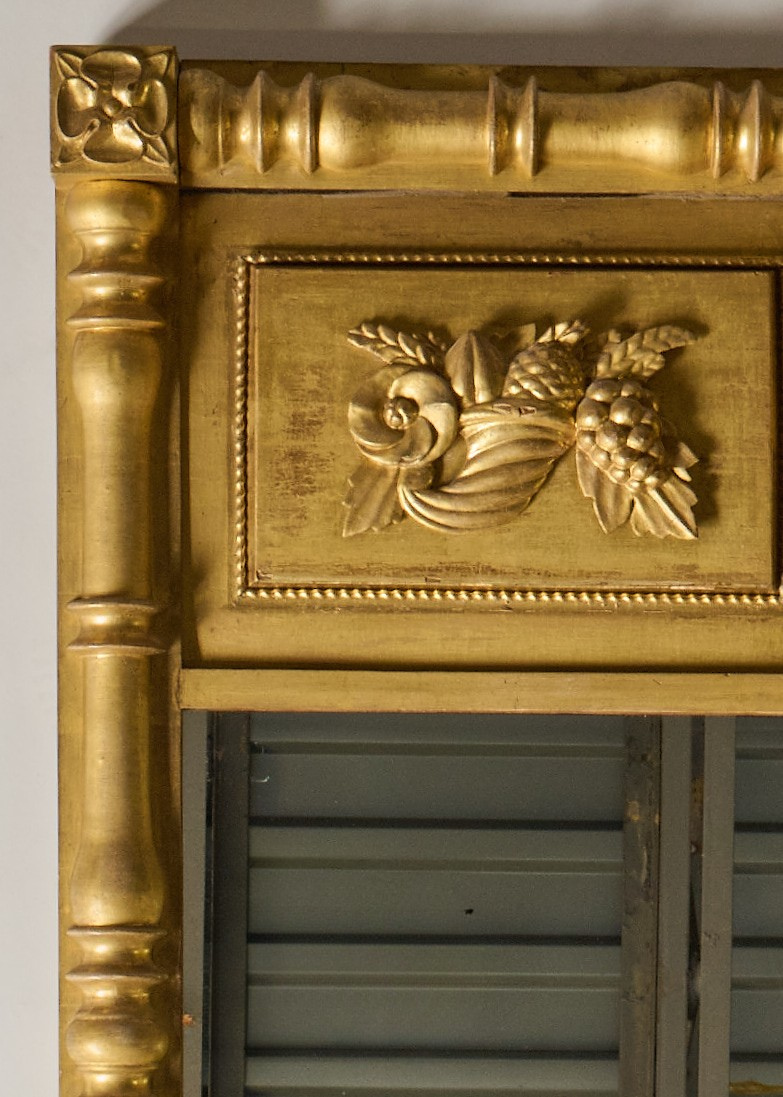 Carved gilt wood mirror featuring rosette corners and a cornucopia panel. Made of wood and gilded with gold leaf.
