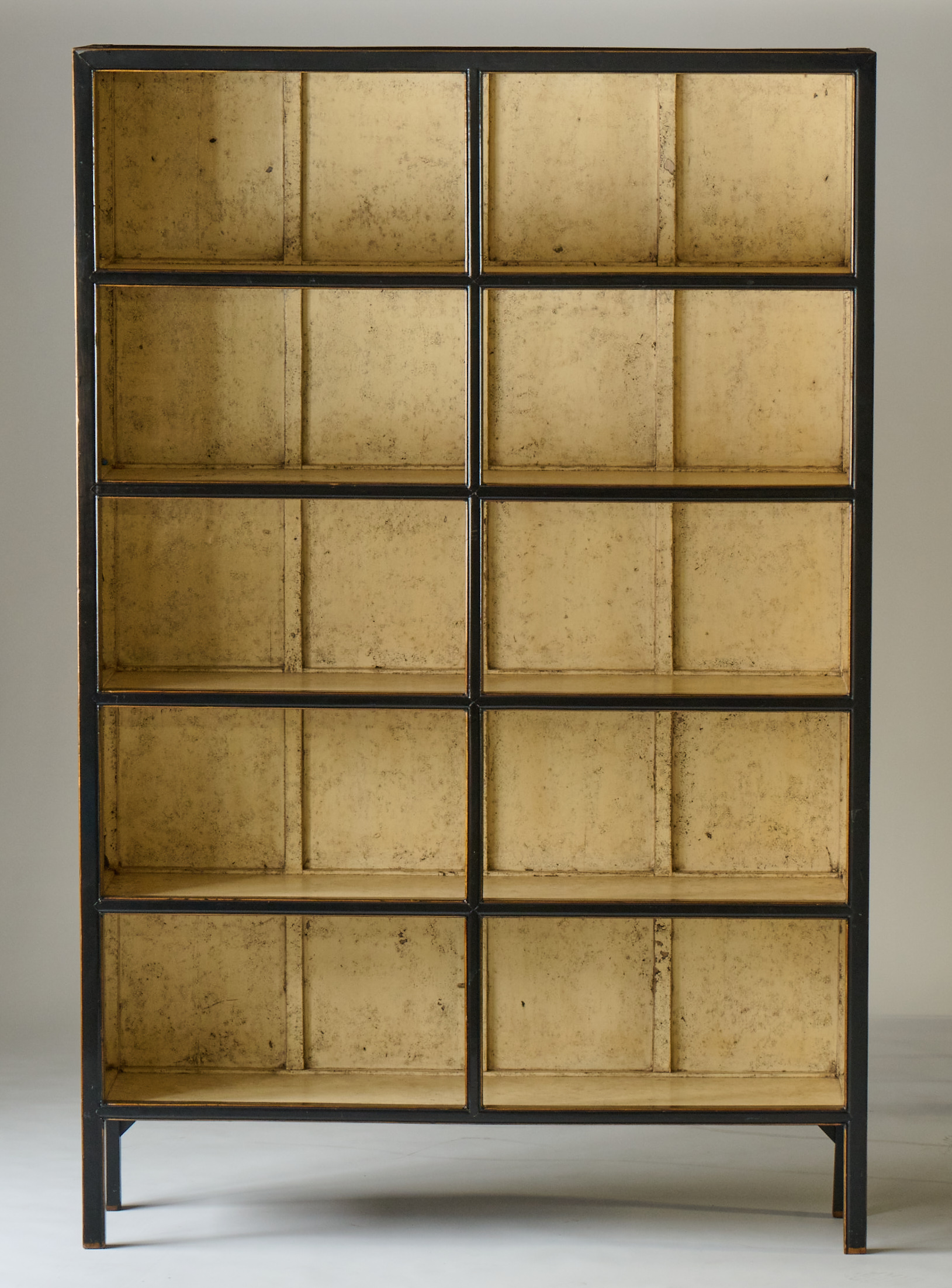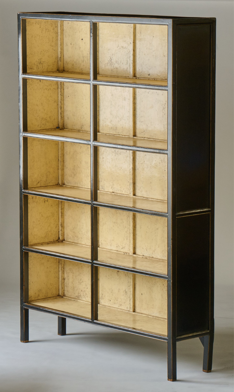 Black lacquer painted bookcase with decorative painted interior.