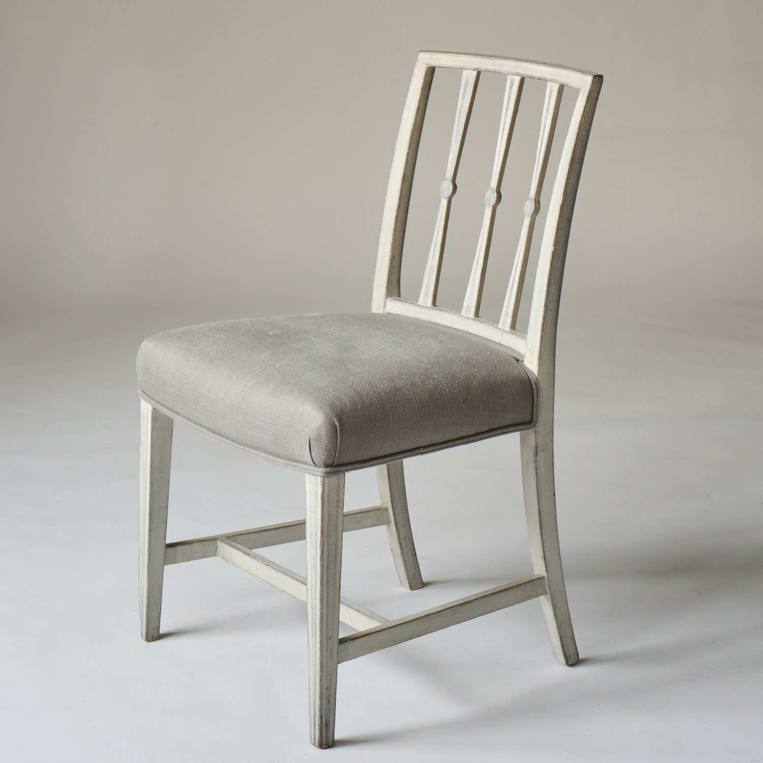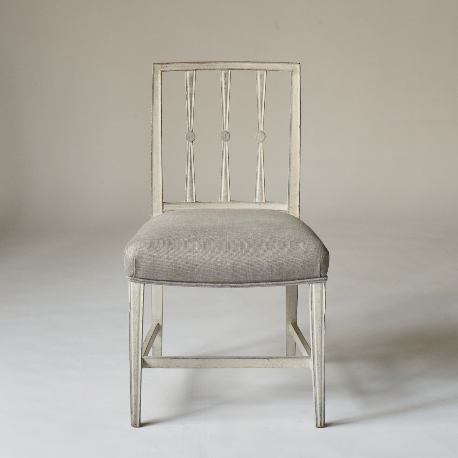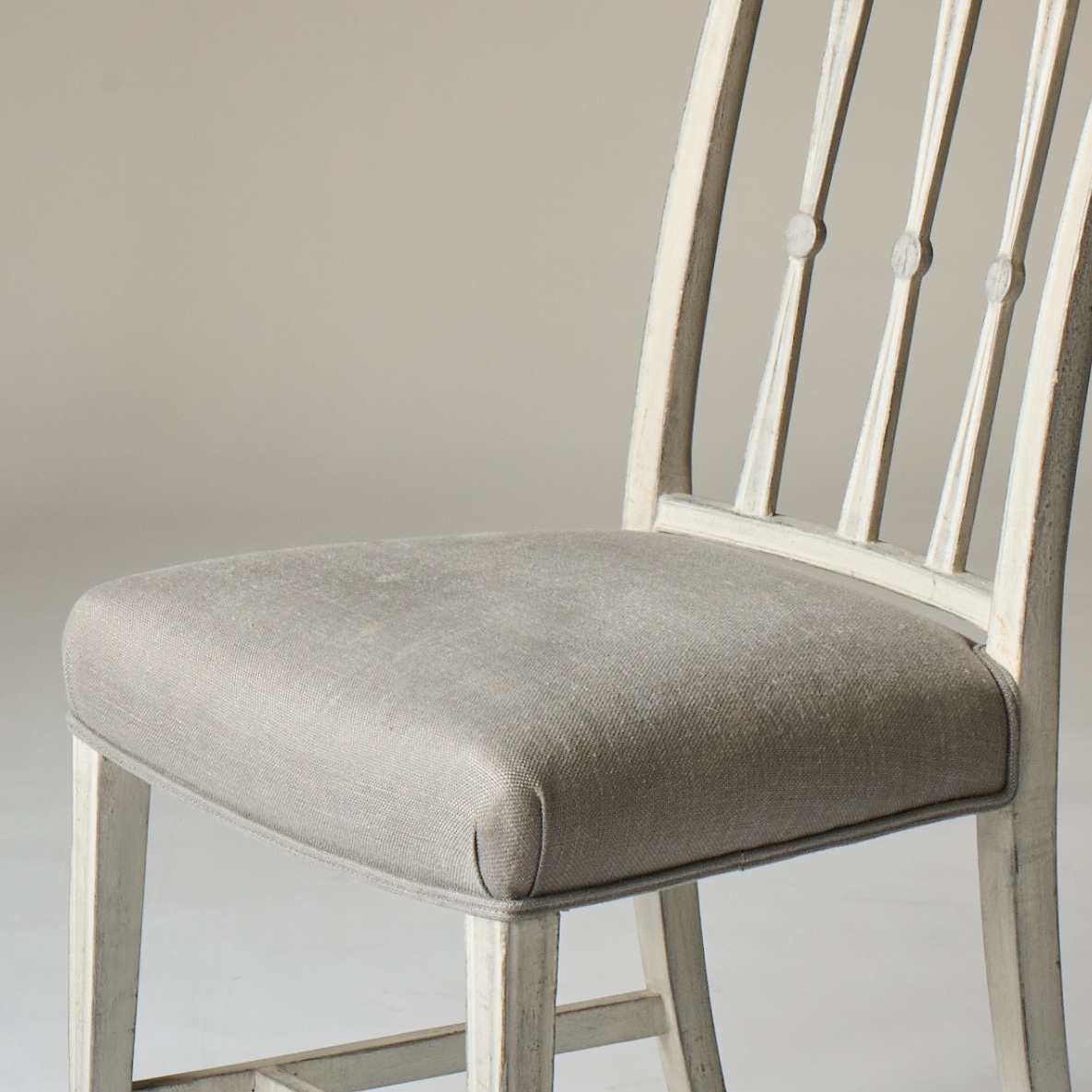 Seat cushions are covered in a grey solid linen.