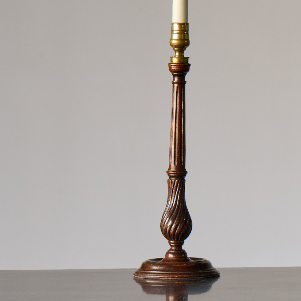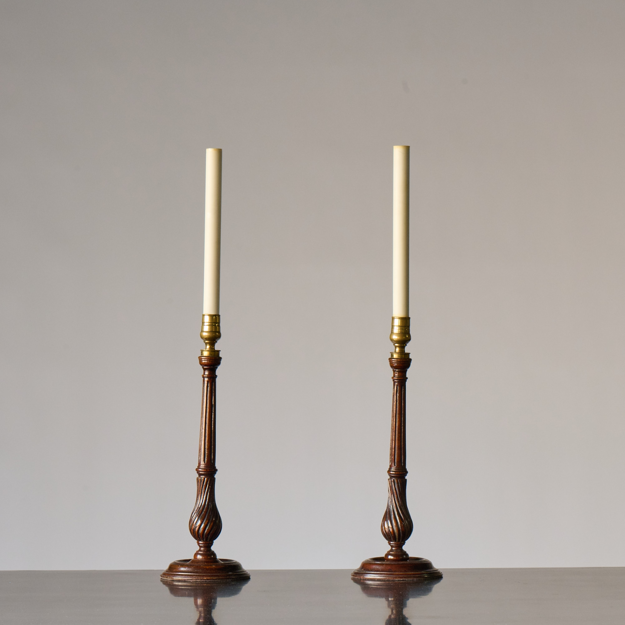 Pair of handsome George III style candlesticks having fluted stems and spiral fluted lower shaft on ring turned base, now as lamps. Lampshades not included.
