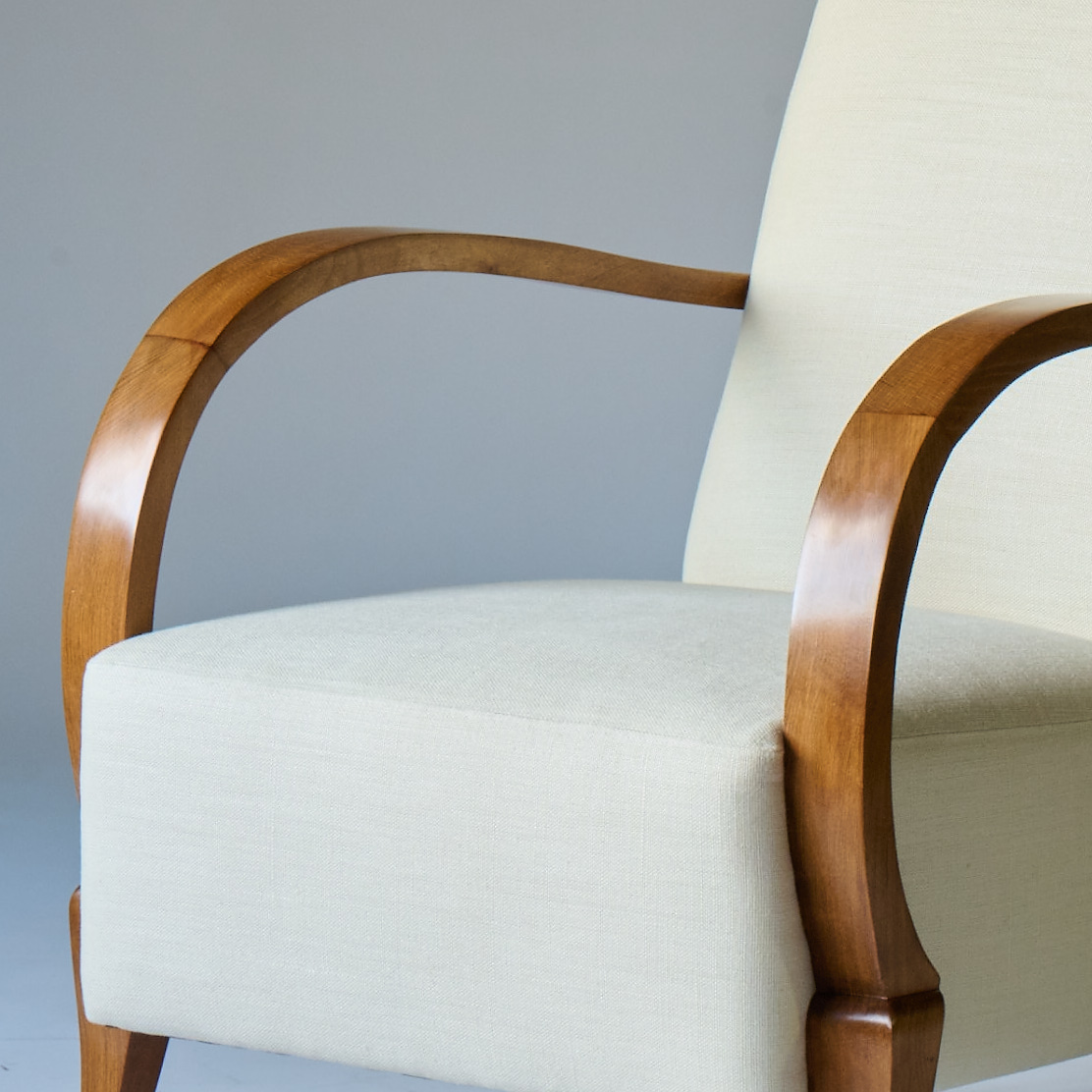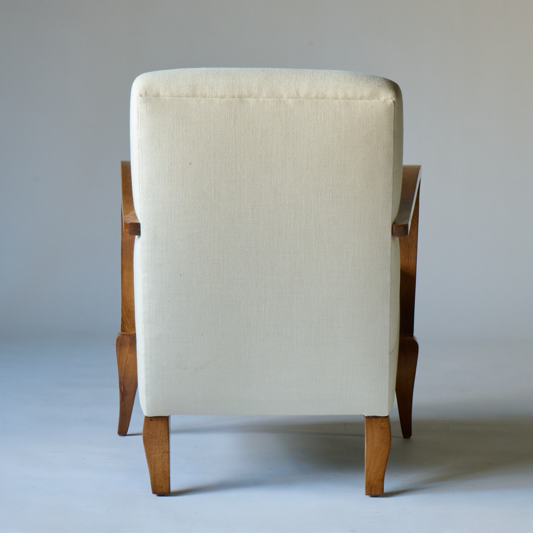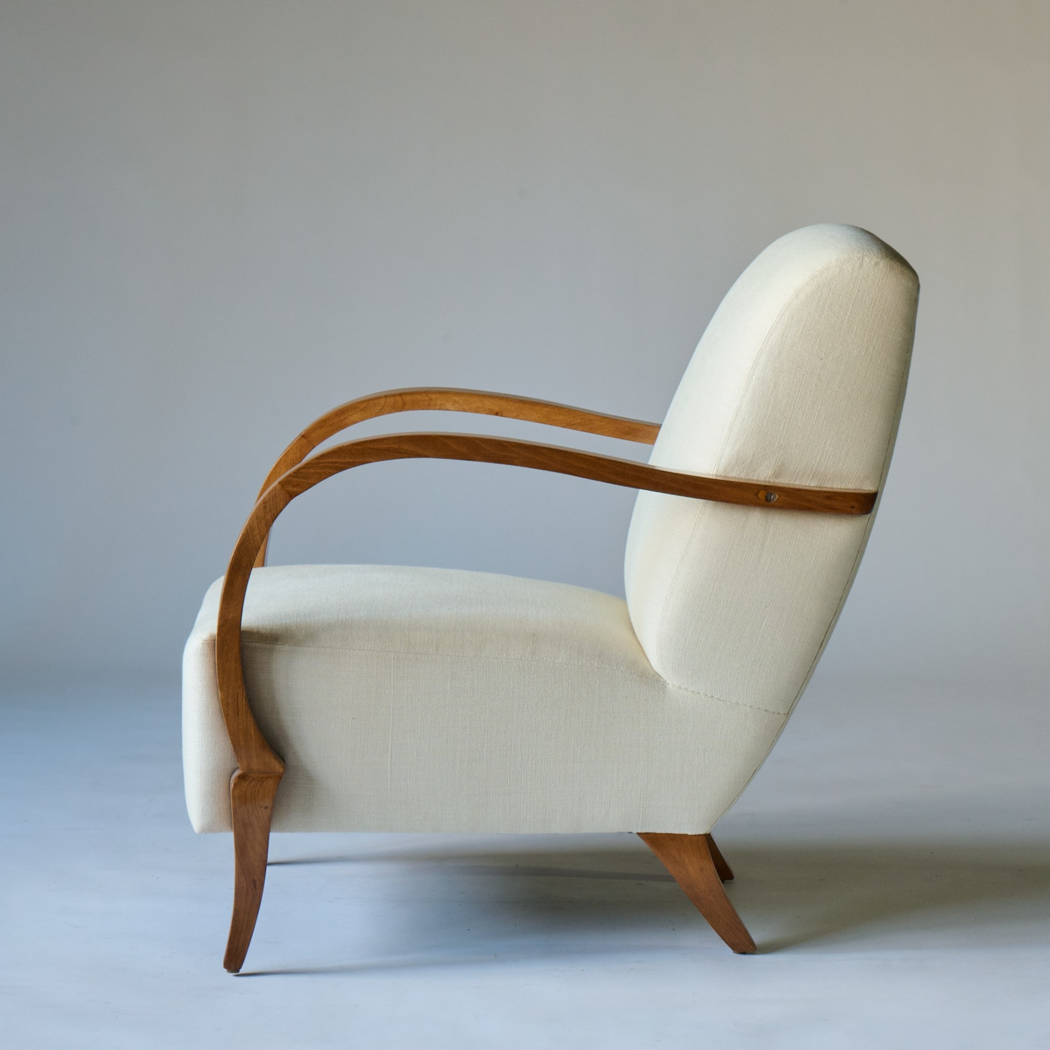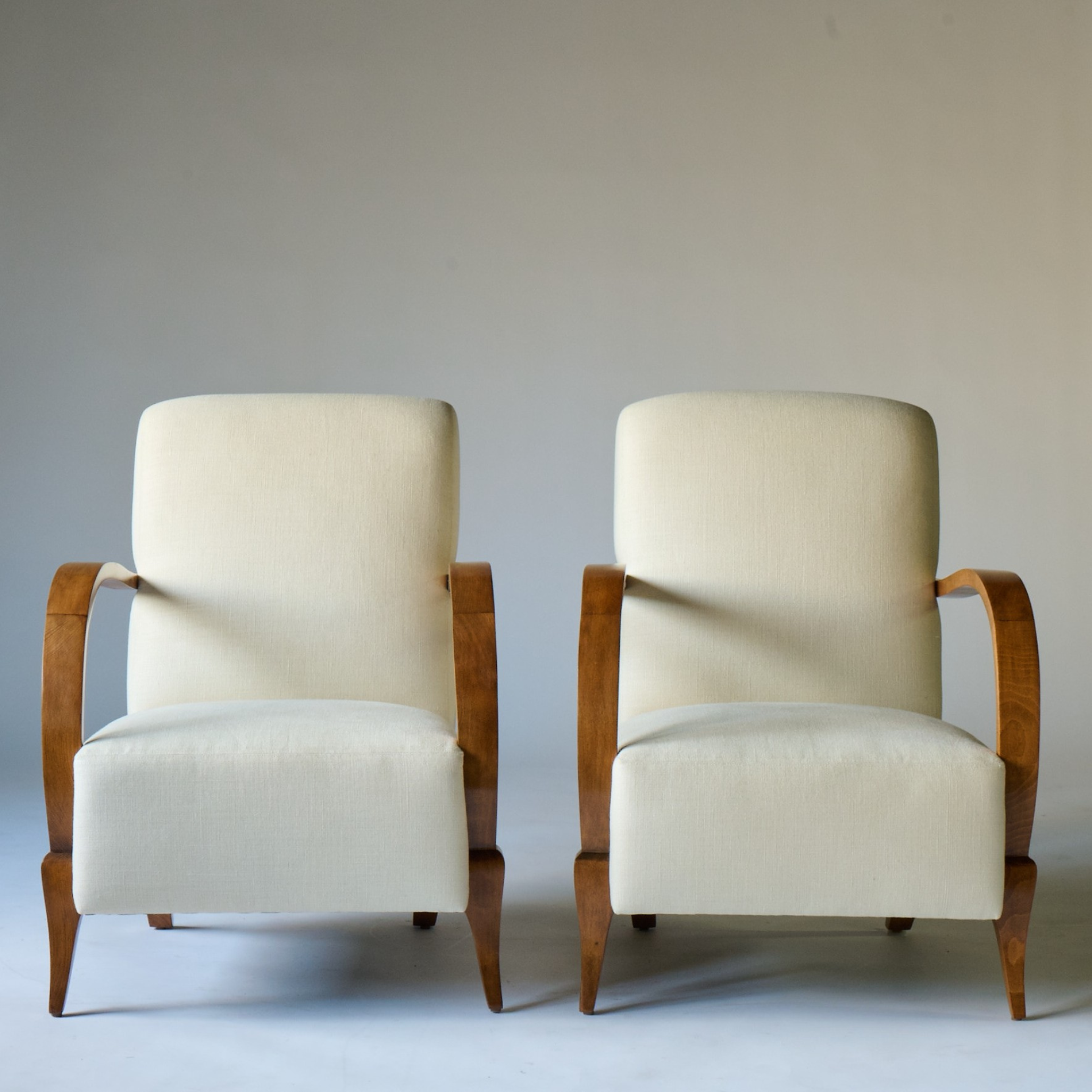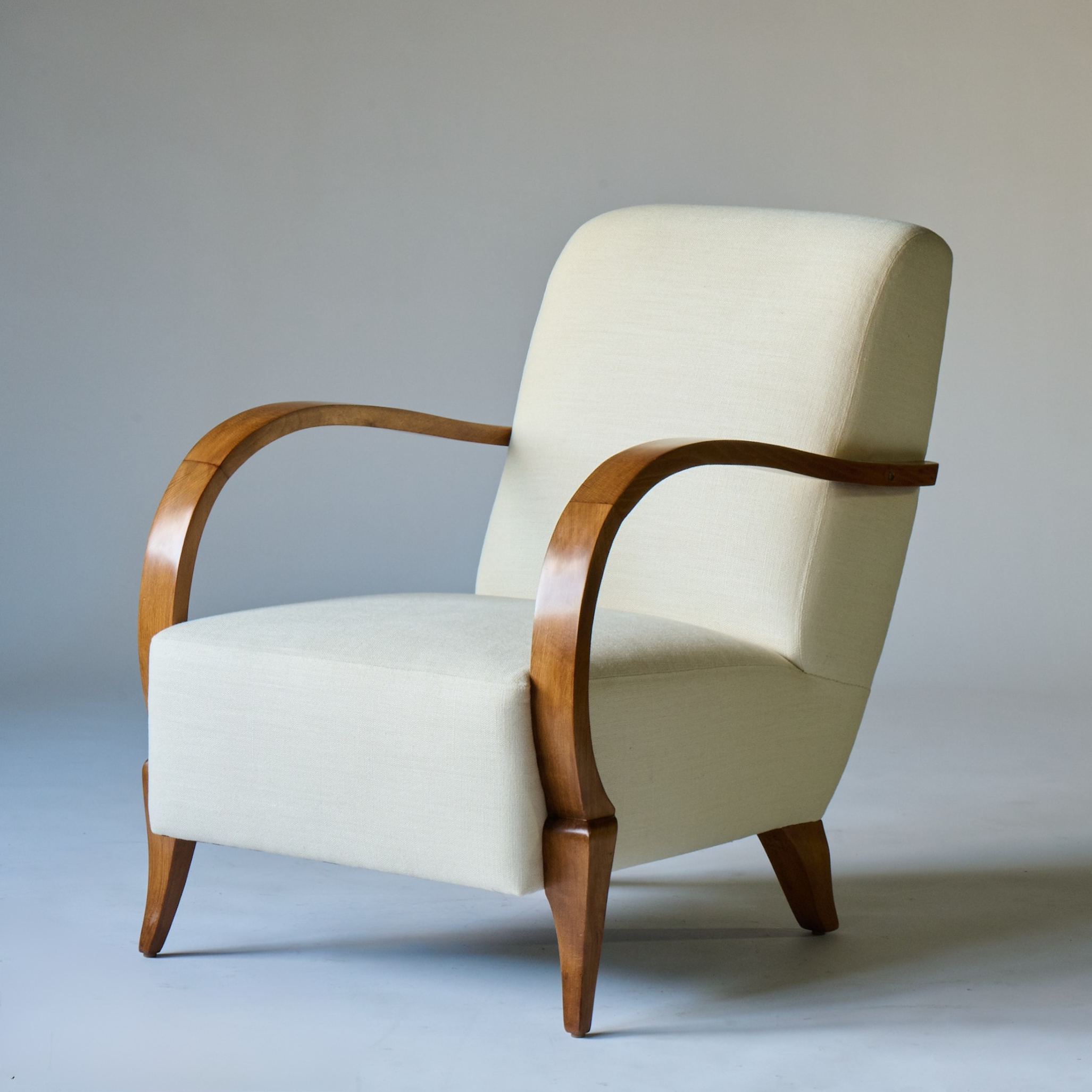 Upholstered armchairs with curved light wood handles on tapering legs. France, circa 1950. Newly upholstered in white linen.
