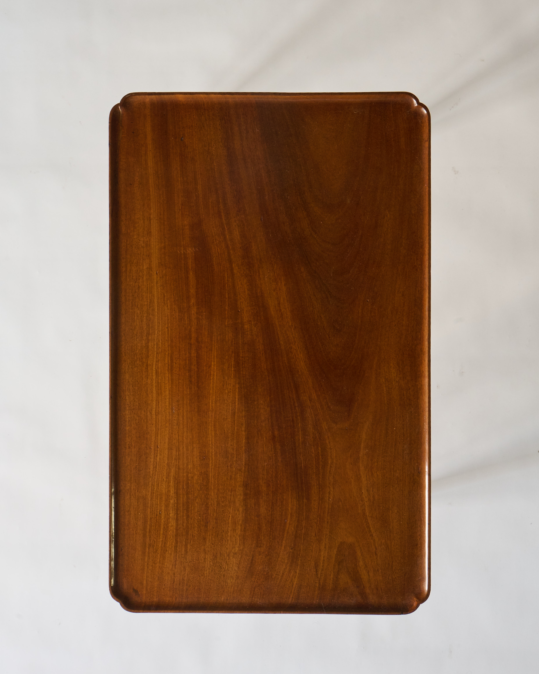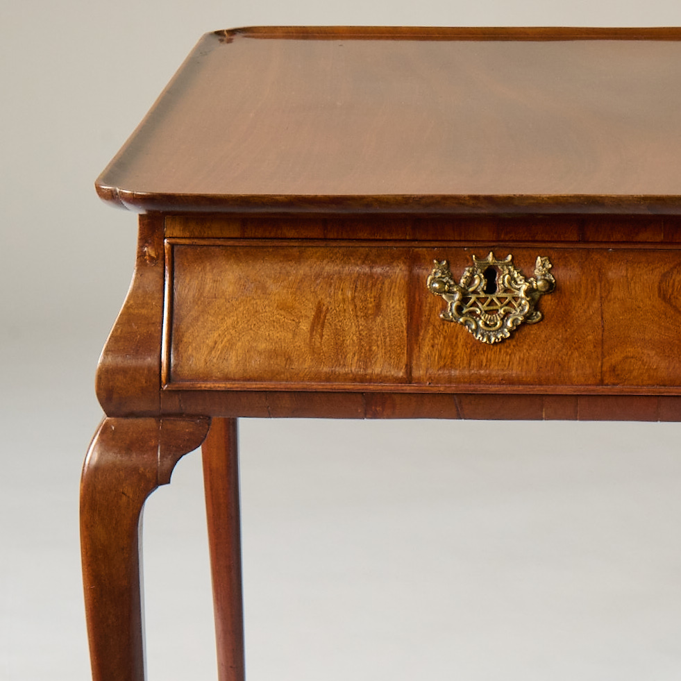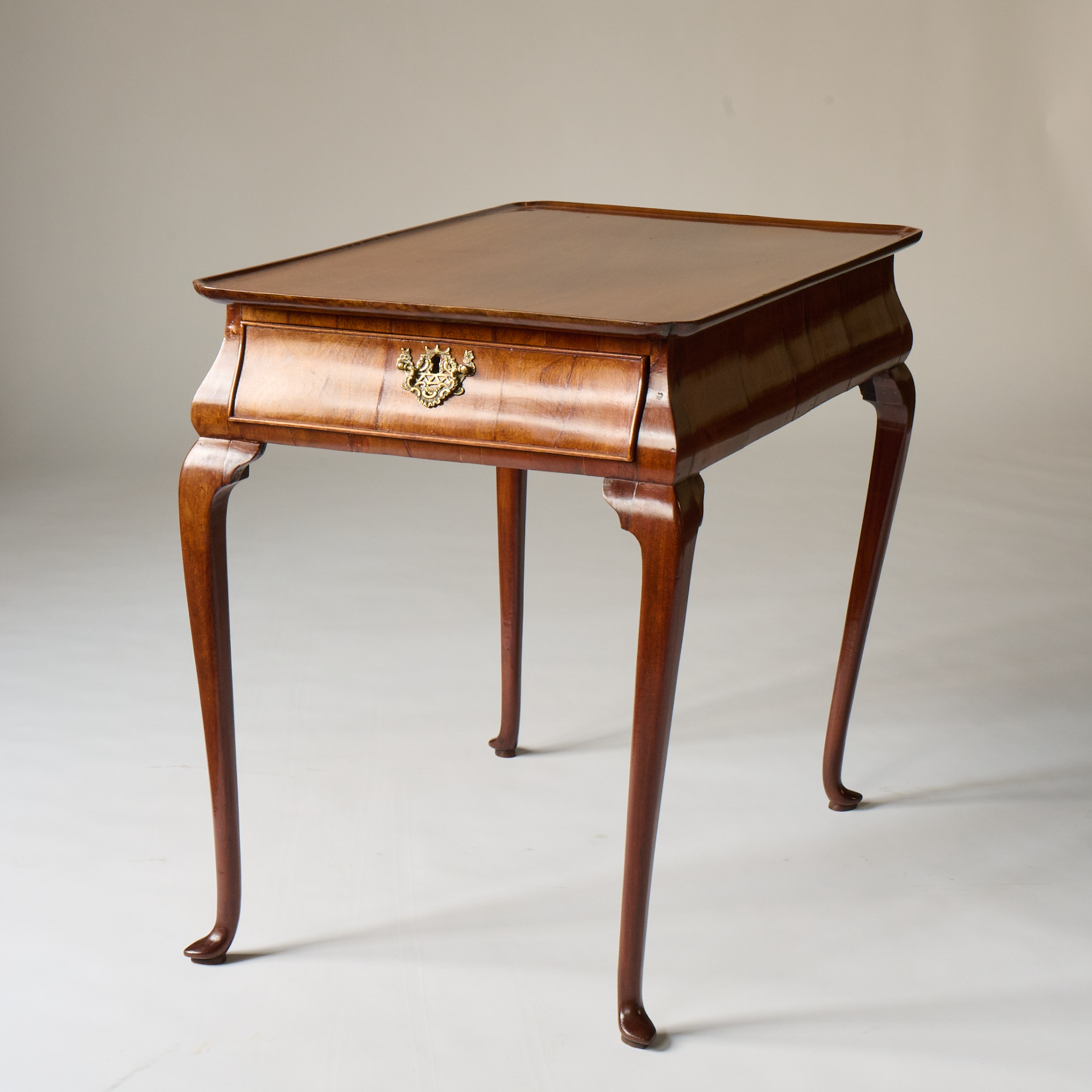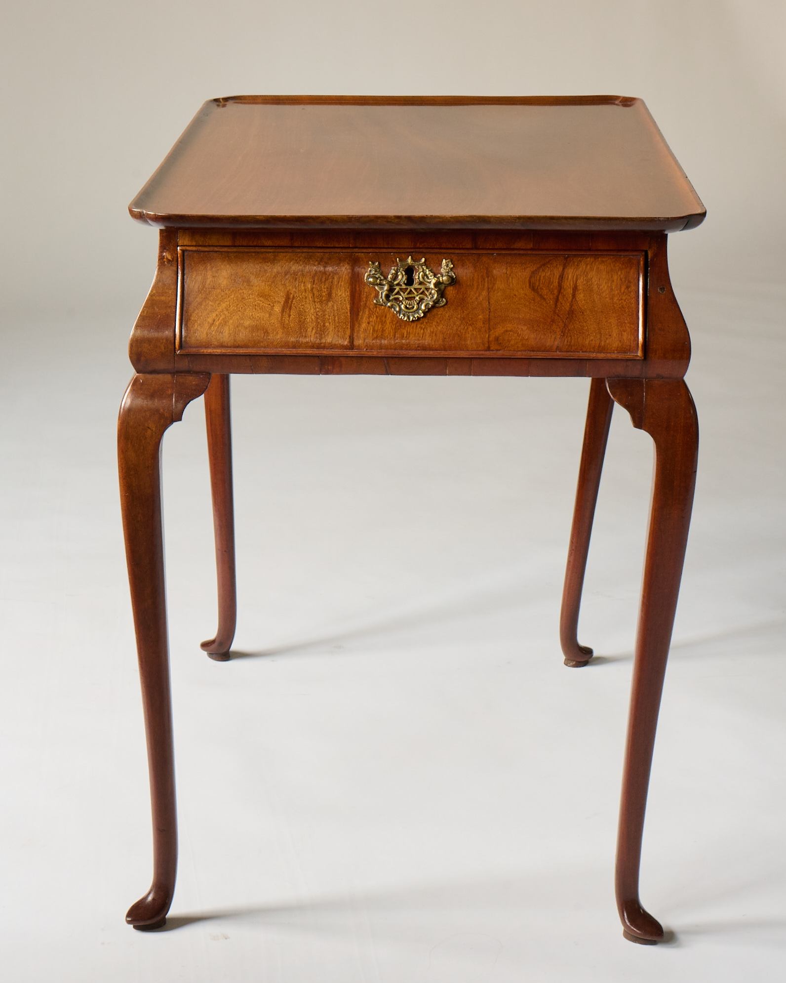 Single side drawer with brass hardware and slender, cabriole legs.
